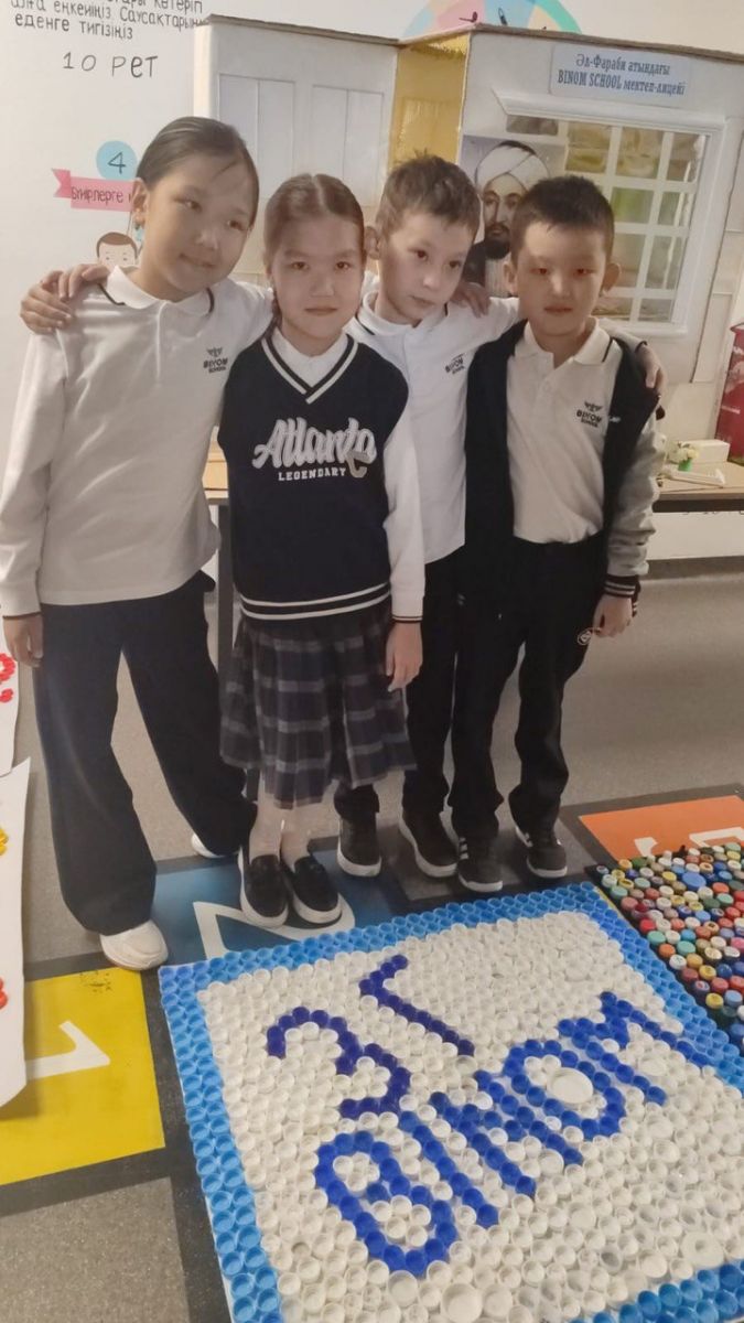 Маленькие шаги к чистому будущему. Недавно в школе Binom прошёл классный час, посвящённый теме бережного отношения к пластиковым отходам. Ученики 3 класса собрали крышки от бутылок и банок — и превратили их в настоящий ковёр и яркие поделки.